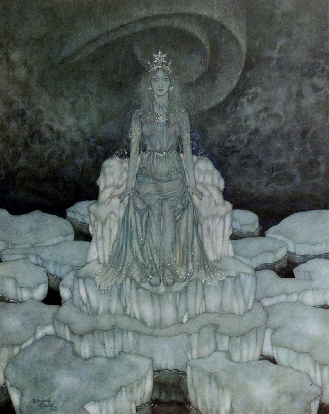 Kay sat quite alone in all those many miles of empty ice halls. He looked at his bits of ice, and thought and thought, till something gave way within him. He sat so stiff and immovable that one might have thought he was frozen to death.